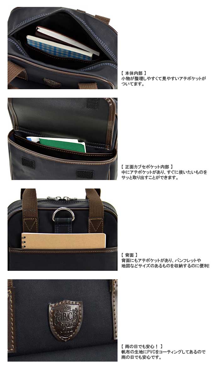 ◆多様なポケットがあるので、小物やノートなど整理整頓がしやすい機能が充実! ◆帆布にPVCをコーティングしてあるので不意の雨にも安心。